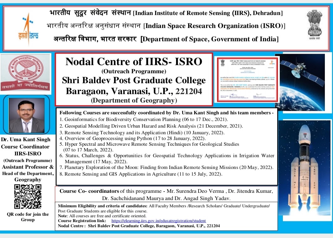 देहरादून स्थित भारतीय रिमोट सेंसिंग संस्थान (आईआईआरएस) स्नातकोत्तर स्तर पर शिक्षा और प्रशिक्षण कार्यक्रमों के माध्यम से रिमोट सेंसिंग और भू-सूचना विज्ञान और उनके अनुप्रयोगों में क्षमता निर्माण के उद्देश्य से एक प्रमुख संस्थान है। संस्थान संयुक्त राष्ट्र से संबद्ध एशिया और प्रशांत क्षेत्र में अंतरिक्ष विज्ञान और प्रौद्योगिकी शिक्षा केंद्र (सीएसएसटीई-एपी) की मेजबानी भी करता है और उसे सहायता भी प्रदान करता है। संस्थान के प्रशिक्षण और शिक्षा कार्यक्रम विभिन्न लक्ष्य/उपयोगकर्ता समूहों की आवश्यकताओं को पूरा करने के लिए डिज़ाइन किए गए हैं, अर्थात, कामकाजी, मध्य और पर्यवेक्षी स्तर के पेशेवरों, नए स्नातकों, शोधकर्ताओं, शिक्षाविदों और निर्णय निर्माताओं के लिए। पाठ्यक्रमों की अवधि एक सप्ताह से दो वर्ष तक होती है। हमारा कॉलेज भारतीय रिमोट सेंसिंग संस्थान के आउटरीच कार्यक्रमों के लिए नोडल केंद्रों में से एक है। विभाग ने 38 आउटरीच कार्यक्रमों का सफलतापूर्वक समन्वय किया है|